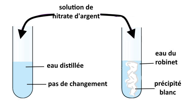 on a réalisé le test au nitrate d’argent avec de l’eau distillée et de l’eau du robinet (voir schéma)